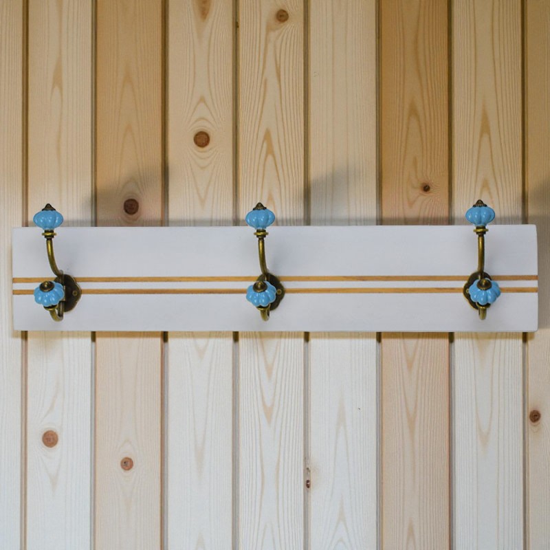 Cabideiro decorativo com base em madeira listrada nas cores azul-marinho e natural, trazendo um toque náutico e elegante ao ambiente. Possui três ganchos duplos em metal envelhecido com detalhes em cerâmica branca, perfeitos para pendurar casacos, toalhas ou acessórios com charme e praticidade. Ideal para halls, banheiros ou áreas de lazer.
