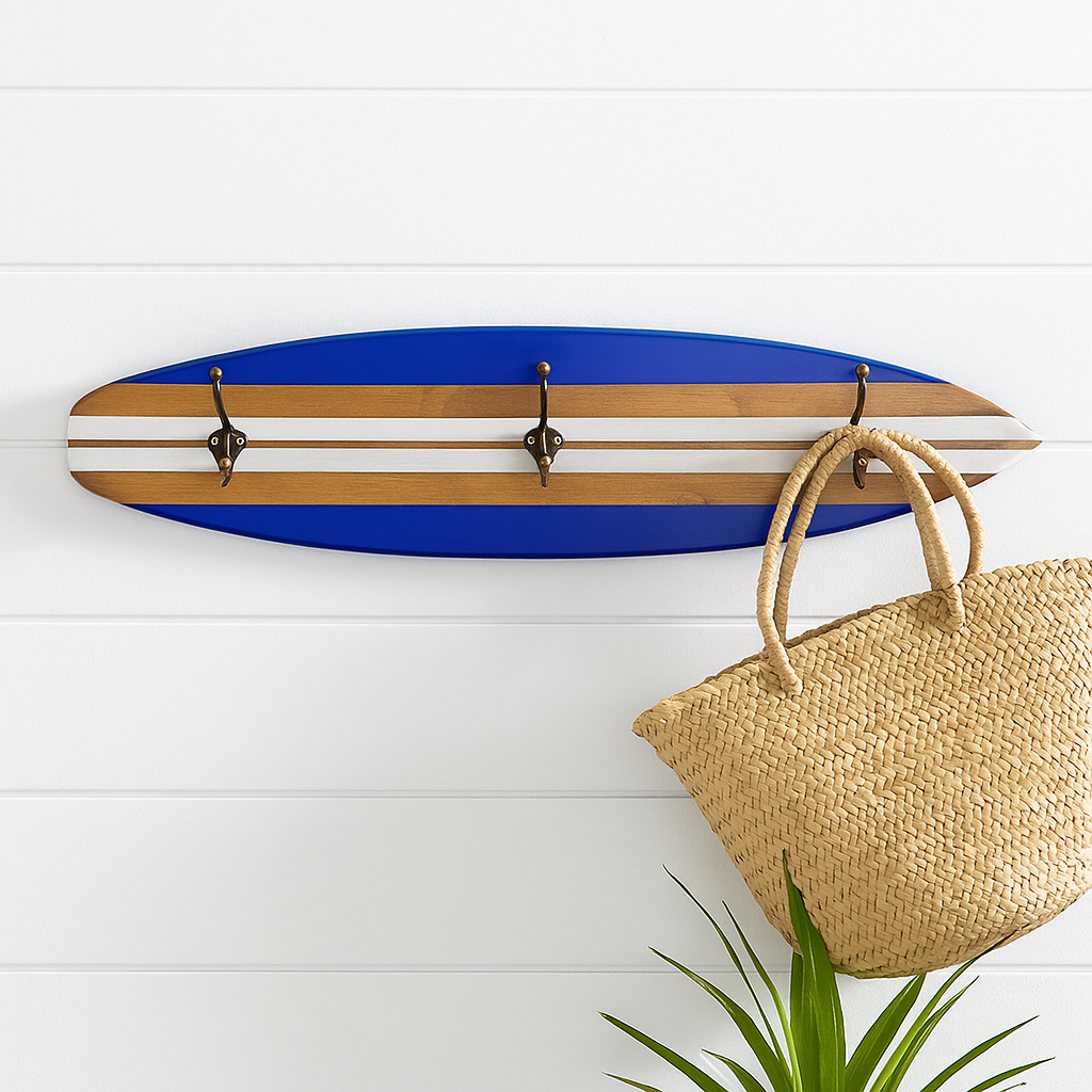 Charmoso cabideiro em formato de remo, com acabamento em madeira e faixas coloridas que trazem um toque náutico ao ambiente. Ideal para halls de entrada, banheiros, varandas ou áreas de lazer, une funcionalidade e decoração com estilo. Possui gancho metálico para pendurar chaves, toalhas ou pequenos acessórios.