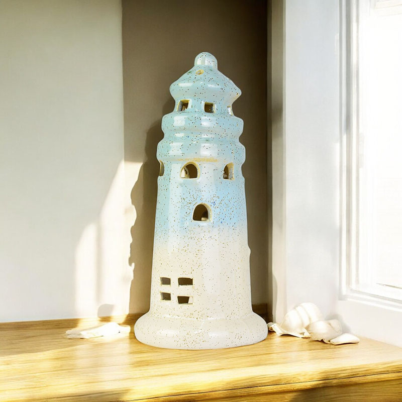 Porta Velas Farol Médio Azul e Branco em Cerâmica