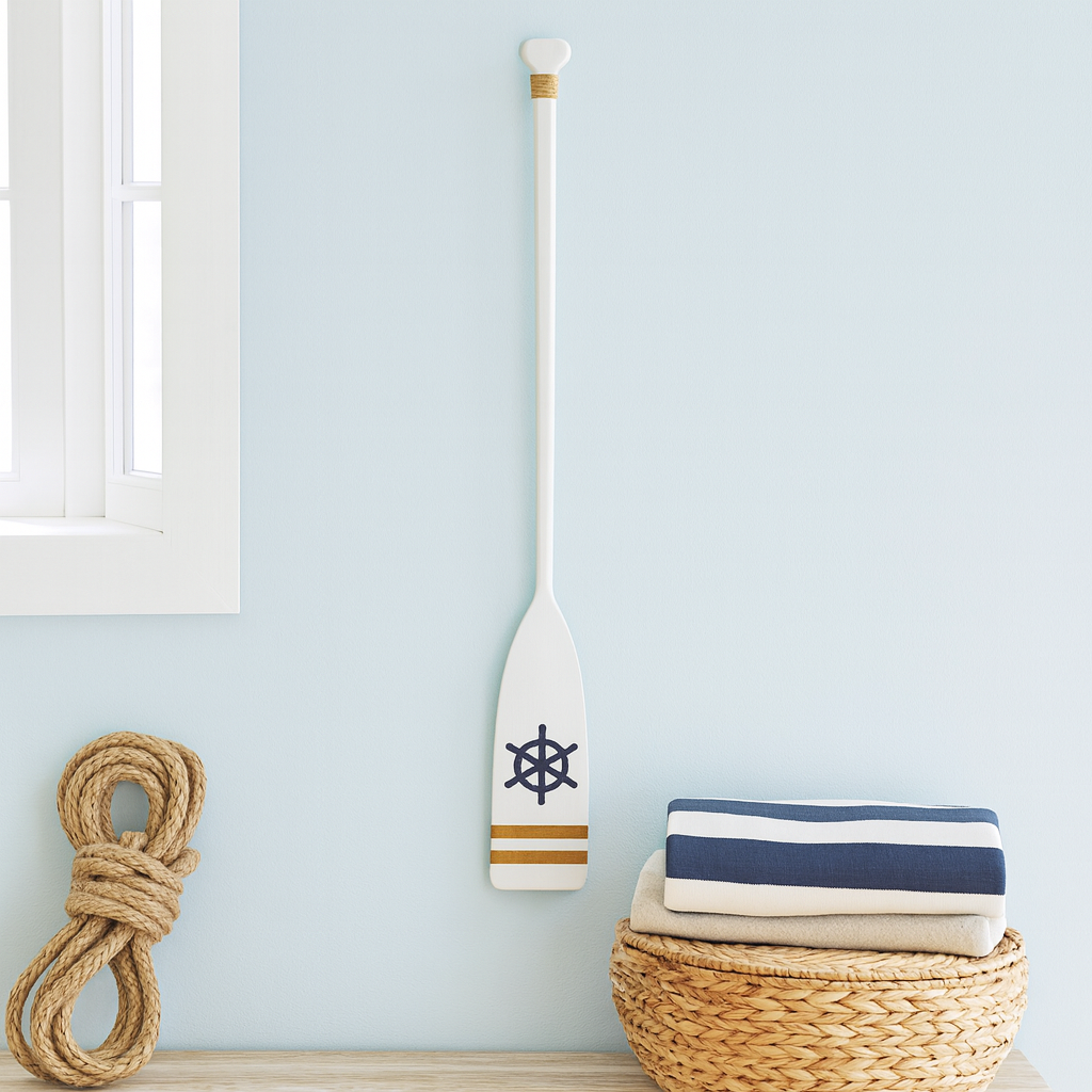 Remo de parede em madeira pintado em branco, com detalhe de timão azul-marinho e faixas douradas. Ideal para compor ambientes com temática praiana ou náutica, trazendo leveza e elegância à decoração. Pode ser usado sozinho ou combinado com outros remos e elementos marítimos.